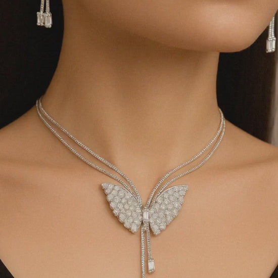 Silver Butterfly Pendant Necklace Set with Crystal-Studded Earrings ? Elegant and Lightweight Party Wear Jewelry