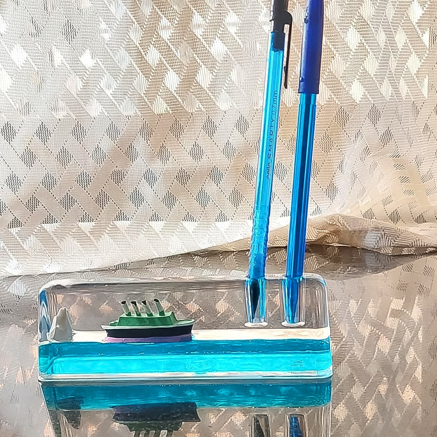- This desk toy has a clear exterior and the inside is filled with soothing blue liquid, a floating titanic and an iceberg. You can gently tilt the paperweight to experience a soothing, stress relieving experience. Great for providing relief for kids and adults who suffer from anxiety.