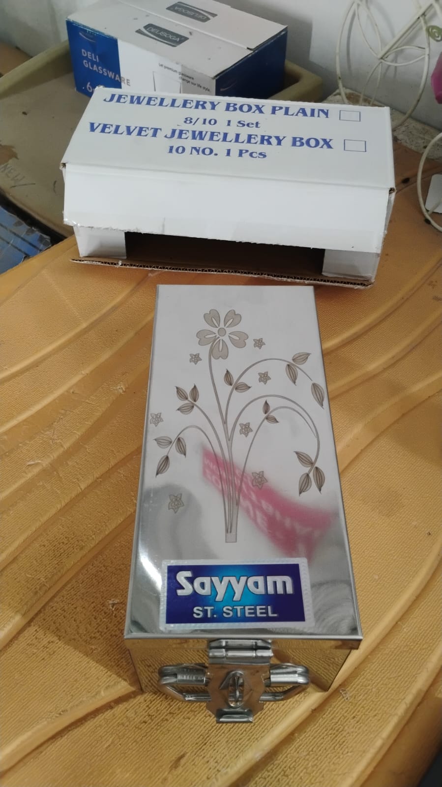This premium Stainless Steel Velvet Jewellery Box is a perfect fusion of utility and elegance. It features a velvet-lined interior in rich red that cushions and protects your precious ornaments, while the stainless steel body ensures long-term durability and strength. The box comes with a locking system for added safety, hooks for earrings, and slots to organize bangles, chains, or small accessories.