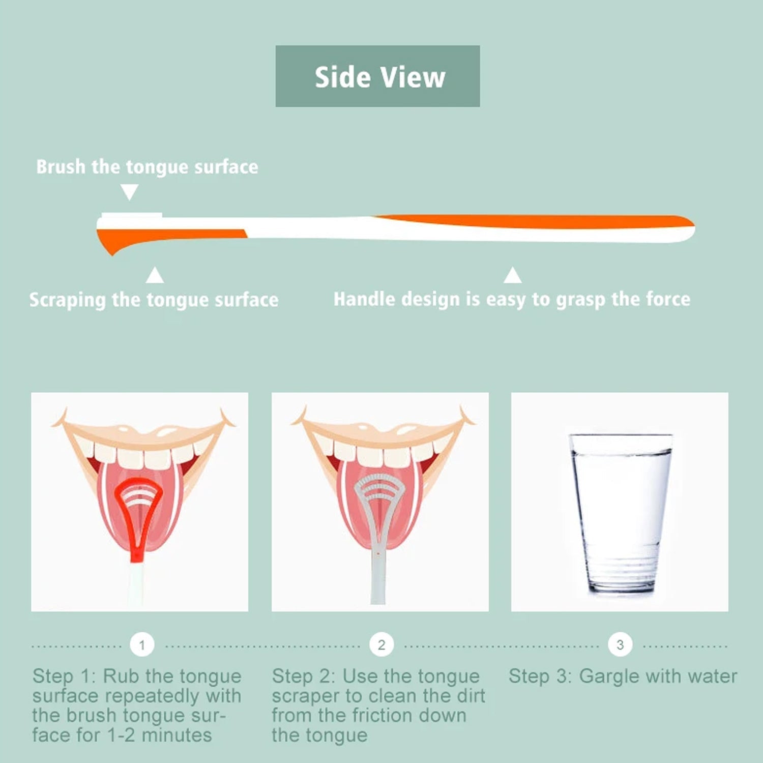 - DOUBLE SIDED AND DOUBLE EFFECTIVE: This product has a double-sided and double effective function, 1side is a smooth tongue scraper that removes most of the tongue moss from the tongue surface, and the other side is a tongue scraper brush with a protrusion that penetrates deep into the crevices of the tongue and cleans the fine stains. The two work in tandem with each other to keep your mouth fresher.